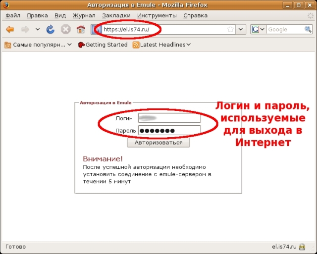 10. После настройки программы, заходим на сайт https://el.is74.ru/ и вводим в появившиеся поля логин и пароль для доступа в Интернет. Нажимаем кнопку «Авторизоваться».