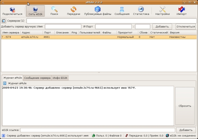11. Открываем программу, заходим на вкладку «Сеть eD2k». В поля «Имя», «IP:Порт» вводим «IS74», «emule.is74.ru» и «4661» соответственно. В поле «Имя» также можно ввести любое название, именно так в дальнейшем aMule будет называть ваш сервер.