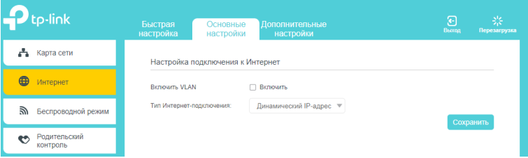 Проследите, чтобы в поле "Тип Интернет-подключения" был выбран Динамический IP-адрес. Если Вы выбрали его сами, то нажмите Сохранить.